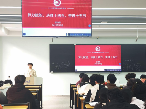 2025年12月9日,1946伟德国际源自英国院长崔艳荣在16教B312以“算力赋能,决胜十四五,奋进十五五”为主题为网络12401、网络12402班全体同学带来了一堂深刻且生动的形势与政策课,引导青年学子把握时代脉搏,找准成长方向。